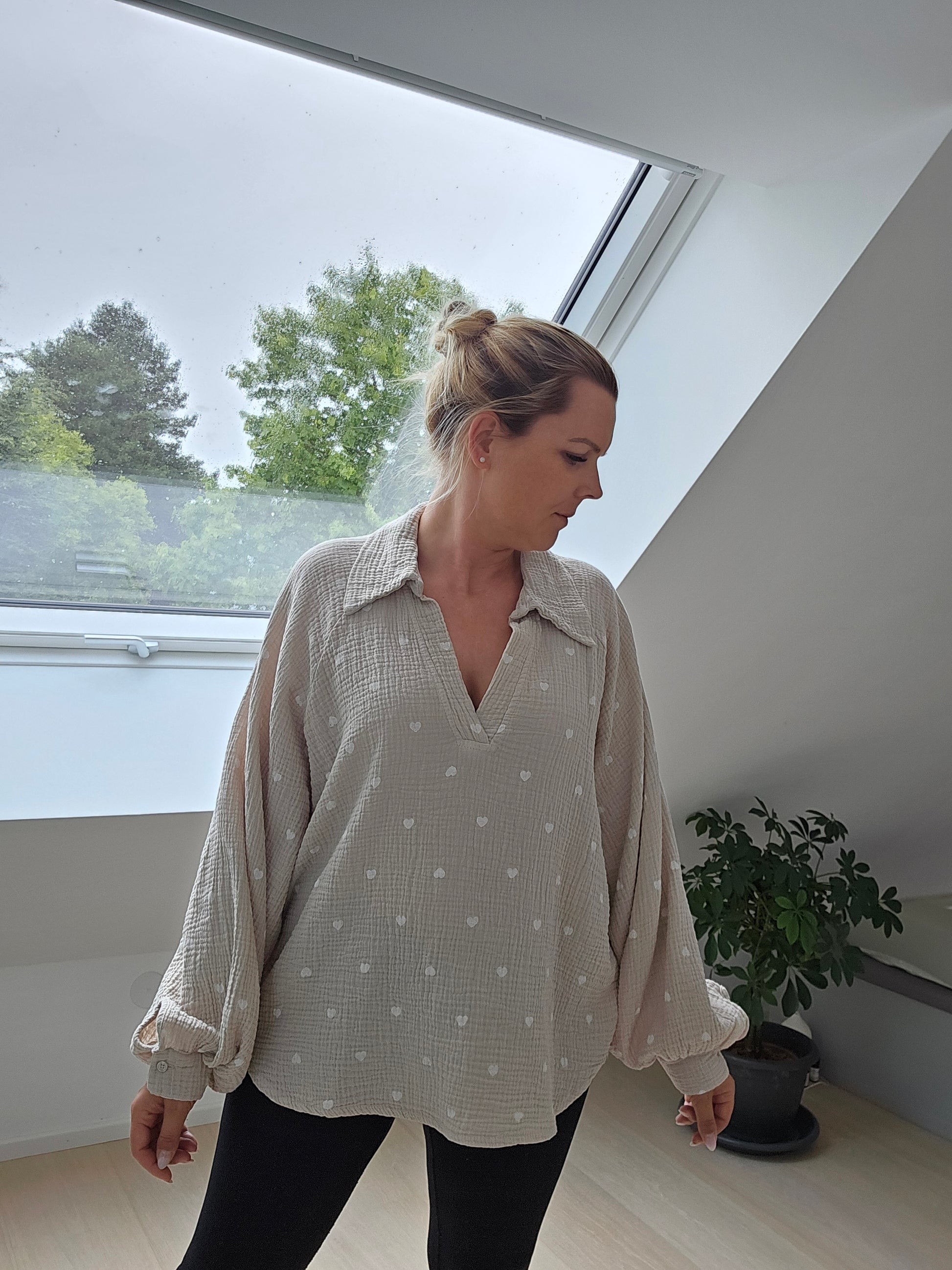 Kurze Oversize Musselin Bluse mit Herz / Beige