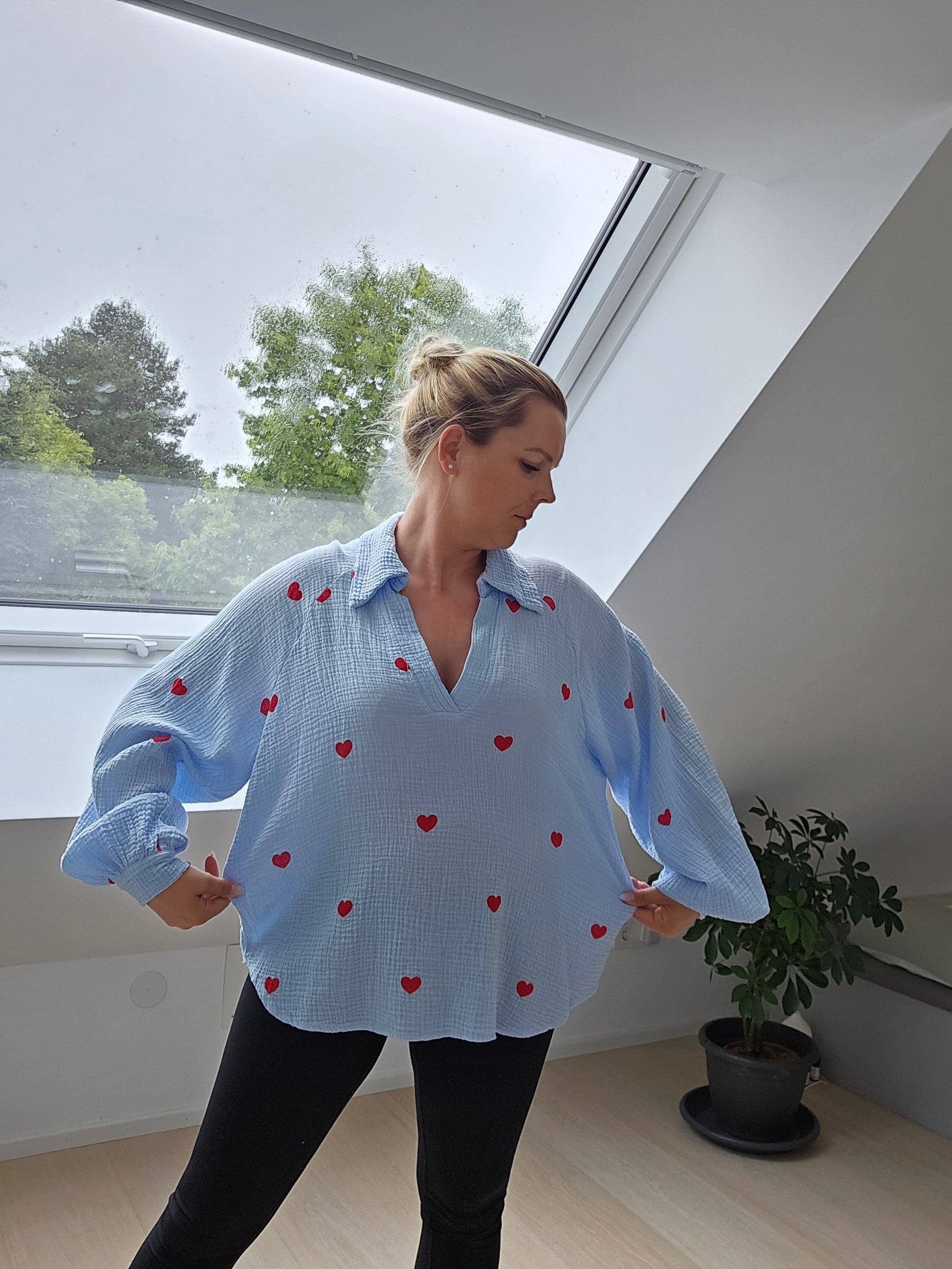 Kurze Oversize Musselinbluse mit Großen Herzen/ Blau